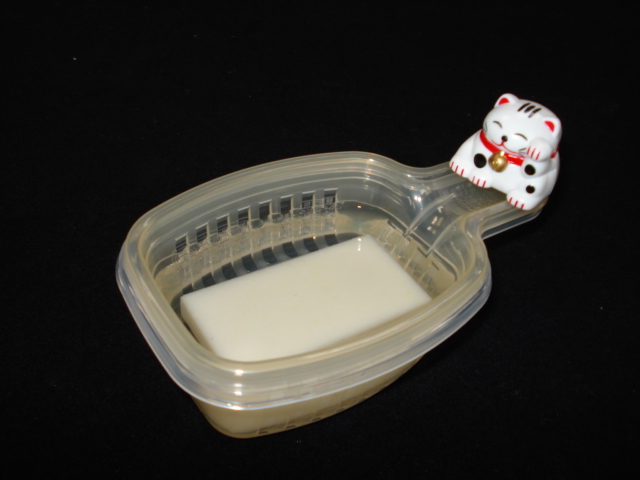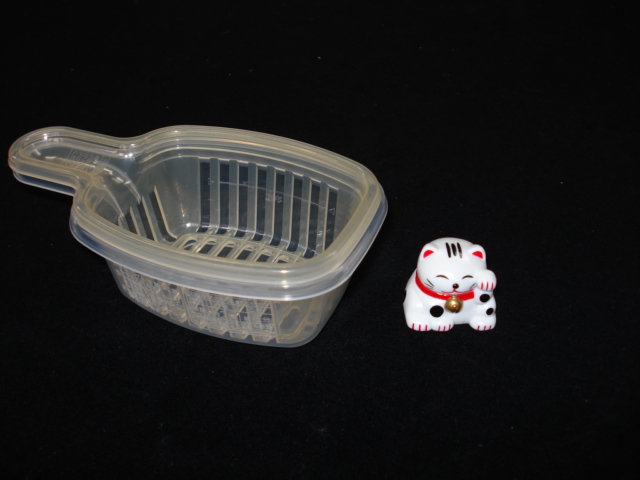 | 先日ある100円ショップで見つけたのですが、 耐熱プラスチック製(?)の容器と、 それにちょうど重なるようなザルのセット。
