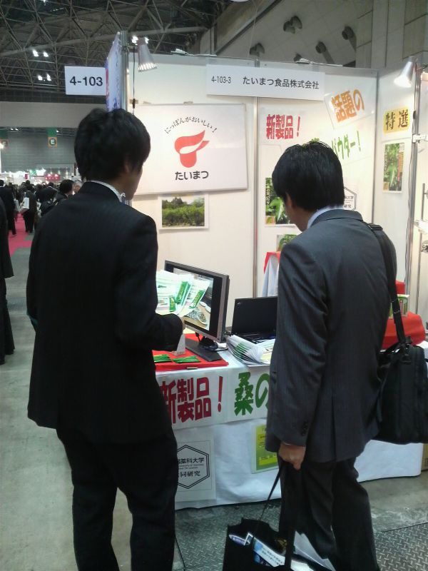 去る2月11日〜13日の間、東京ビックサイトで 「スーパーマーケット・トレードショー」が催されました。 当社も「桑の葉パウダースティックタイプ」を出展しました。 | | 規模の大きさに比例するかなりの来場客数で、 弊社ブースもサンプル到着に伴い華やかに陳列!