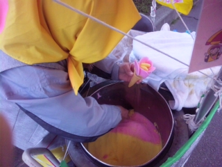 要するに、 「おばあちゃんがヘラでアイスをすくってくれる」 らしいんです。 (た、単純!) | | デッカイずん胴鍋の中を見せてもらうと、 ピンクと黄色のアイスクリームがこんな風に二色に分かれてます。
