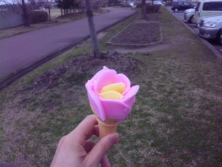 おばあちゃんに1つ注文! | アイスクリームの表面を引っかくように、 薄くコーンにアイスを乗っけてゆきます・・・・ | | 盛り付けはこんな感じに仕上がりました☆