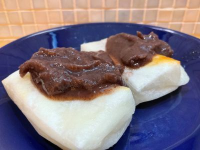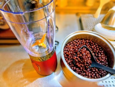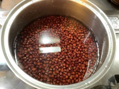 | @あずきを水洗いし、鍋でグツグツ煮ます。 ※沸騰したら2〜3回水を替えて煮る。 | | | A柔らかくなりましたら、ジューサーミキサーに入れる。 | | Bあずきの粒がなくなるまで回す。 | C最後に鍋にもどし、お好みの甘さで煮る 砂糖、ざらめなどお好みの甘味料で味つけ
